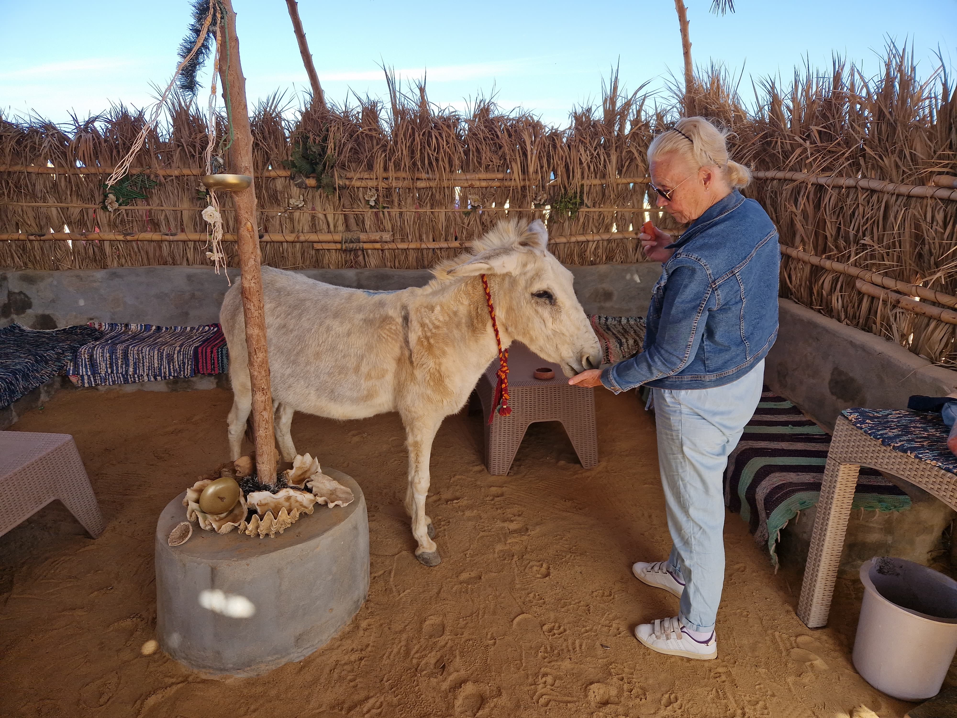 Abdu truly loves his horses and all the animals in his care: the very fat donkey, the camel, and the many rescue dogs and cats. We also have a shady manège where the horses can relax and move around freely, and a Bedouin tent where riders can chill out before or after their trip.